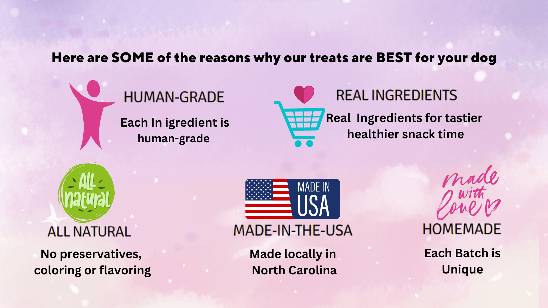 We understand some dogs have food allergies and do best when their treats contain minimal, high quality ingredients. After reading countless labels, with ingredients you didn’t know or couldn’t pronounce, and way too many dog food/treat recalls, we decided to dabble in making our own healthy treats for our fur babies.